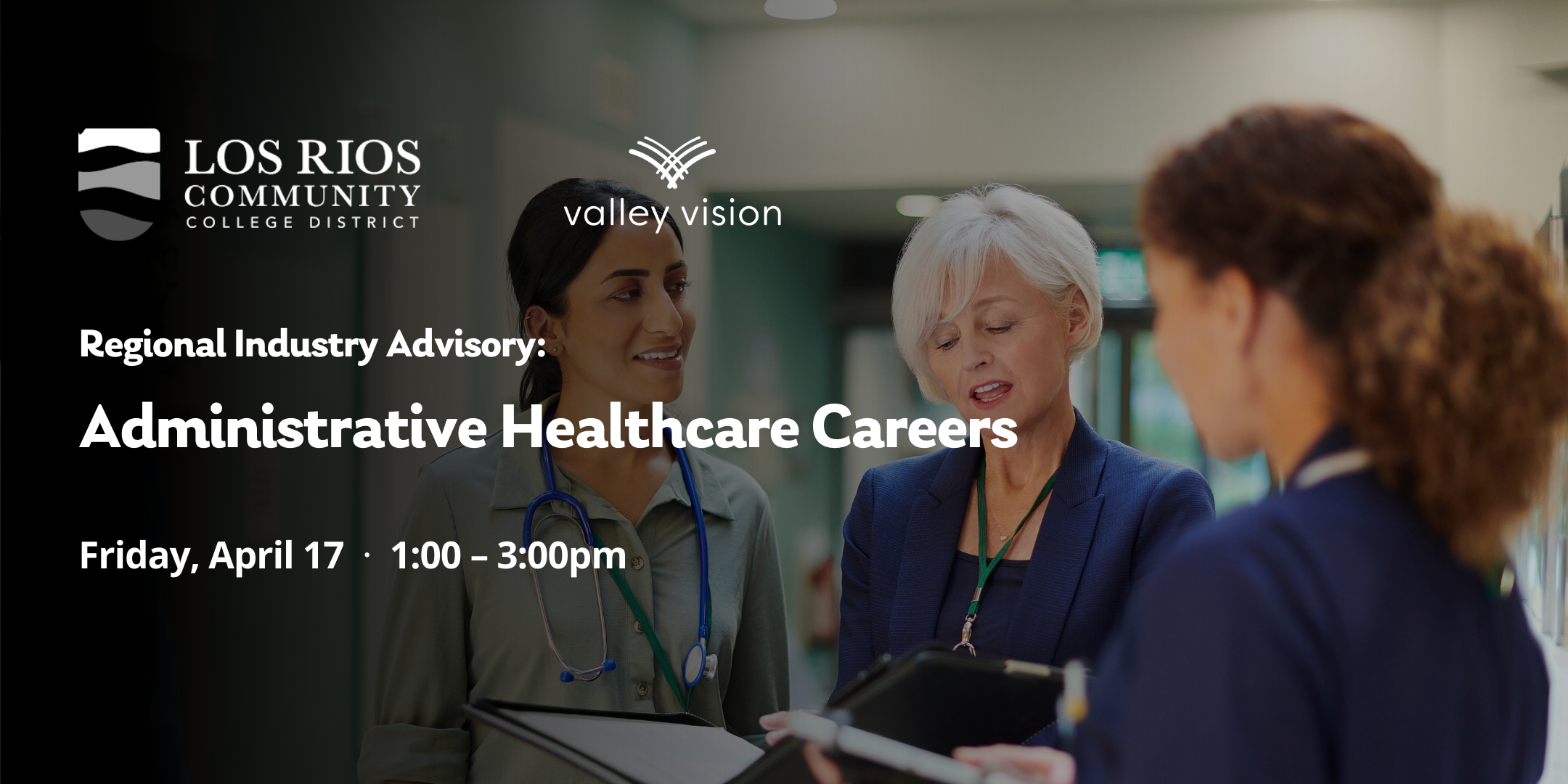 Join Los Rios Community College District and Valley Vision for the Administrative Healthcare Advisory on Friday, April 17, from 1:00–3:00 p.m. This regional convening will bring together healthcare leaders, administrators, educators, and workforce partners to explore current and emerging needs across healthcare administration.